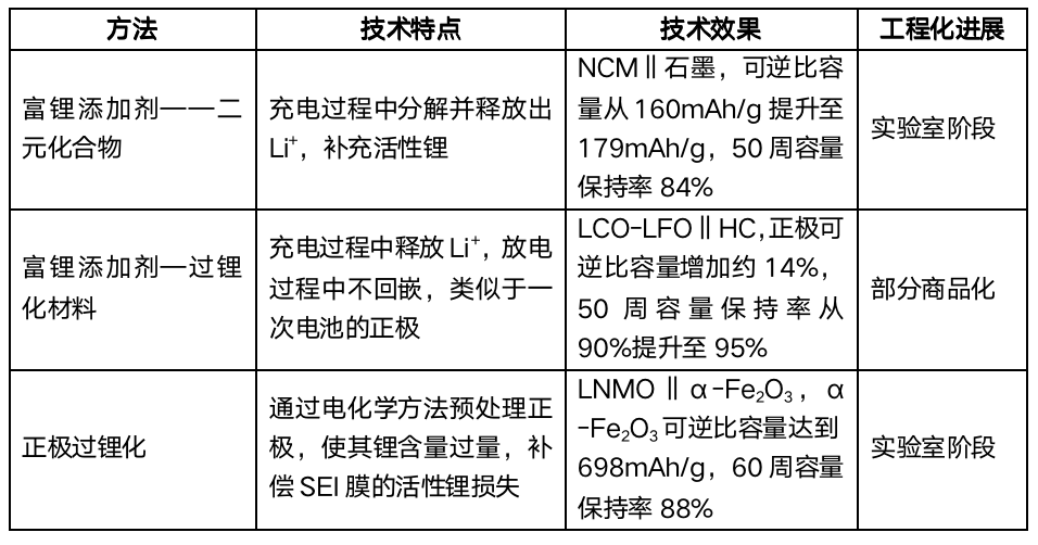 正極預(yù)鋰化是指通過(guò)額外添加的活性鋰源,來(lái)補(bǔ)償不可逆的活性鋰損失,確保電池內(nèi)活性鋰的充足。相較于流程復(fù)雜?安全風(fēng)險(xiǎn)高,且對(duì)環(huán)境和工藝要求較高的負(fù)極預(yù)鋰化技術(shù),目前研究較多的正極預(yù)鋰化技術(shù)集中在高性?xún)r(jià)比的富鋰添加劑開(kāi)發(fā)方面。