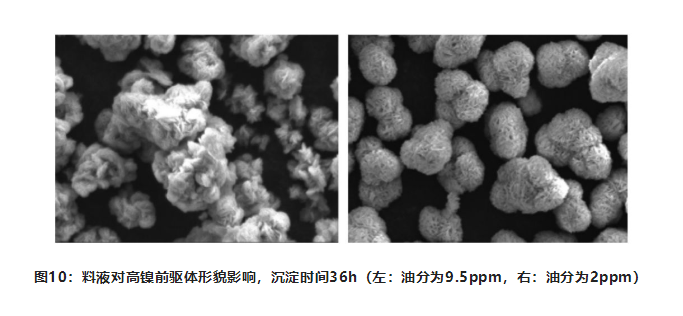 在實際生產(chǎn)過程中,少量的有機(jī)溶劑會對共沉淀反應(yīng)造成很大困擾,而鎳鈷錳原料提純過程中會用到有機(jī)溶劑,少量的有機(jī)溶劑會帶到前驅(qū)體的反應(yīng)中。料液油分越高,振實密度越低,前驅(qū)體的形貌變得疏松,無法成球,造成顆粒無法生長,粒度分布寬化。